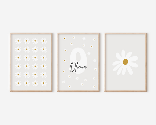 Minimalistisches Daisy-Baby-Namensposter – A4 | A3 | Wandkunst fürs Kinderzimmer | Anpassbares Daisy-Trio-Poster-Set
