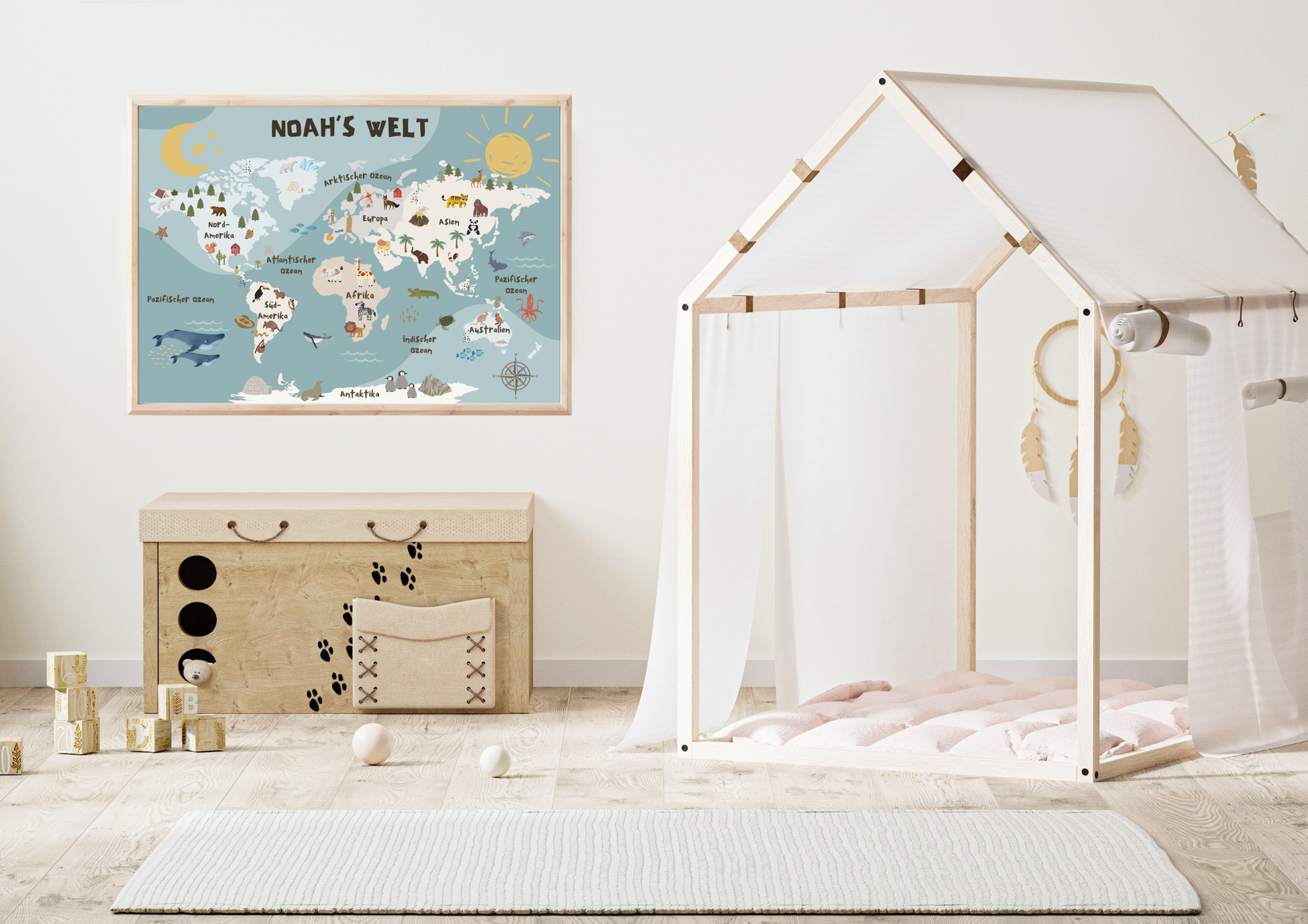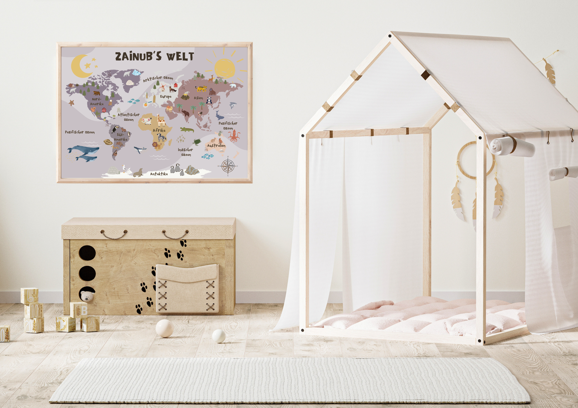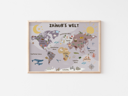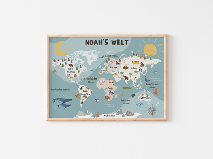 Transform your child's bedroom into an adventurous space with our world map designed especially for kids! This colorful and educational wall art inspires curiosity and encourages learning - the perfect addition to any nursery or playroom. The map features colorful illustrations of animals, landmarks and continents that allow your little ones to explore the world from their room.
